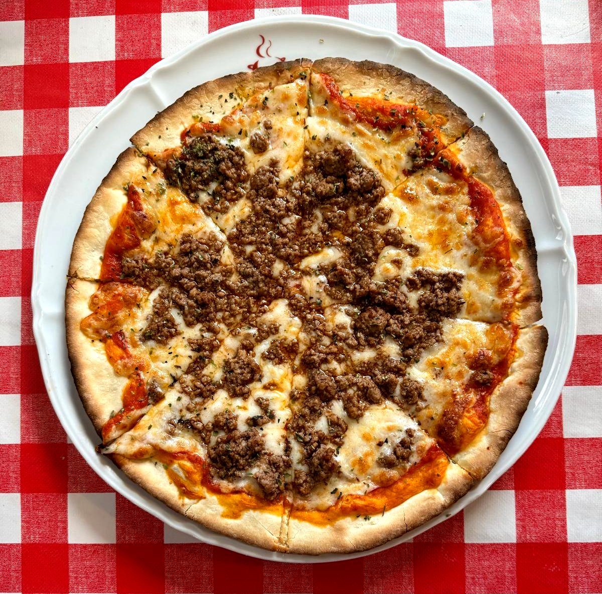Prueba nuestra pizza boloñesa casera en Marbella. Masa artesanal, salsa de tomate, mozzarella y carne de ternera gallega cocinada a fuego lento.